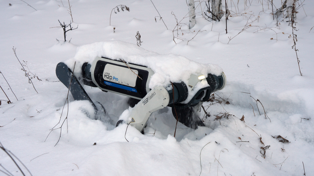在牙克石的低温、低光照的严苛条件下,山猫M20轮足机器人验证了云深处机器狗从基础移动、环境感知到多任务执行的全链路可靠性,充分体现出其在极端低温环境下持续、稳定作业的综合能力,为完成物资搬运、区域巡护、科研探索等多种任务提供了实战验证。