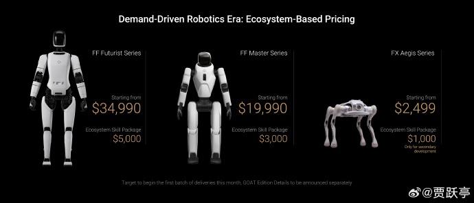 贾跃亭发布的图片显示,Futurist系列机器人定价34990美元起,Master系列机器人定价19990美元起,Aegis系列机器人定价2499美元起。